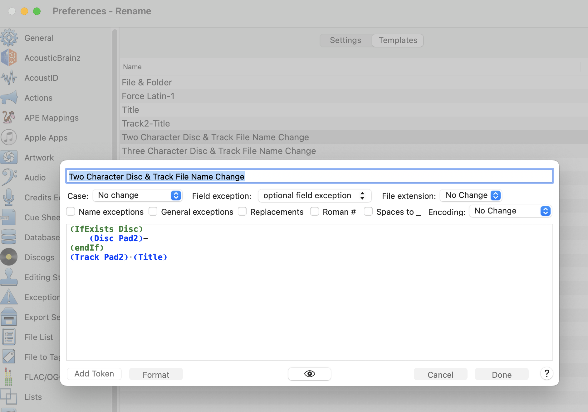 The only ones I really use combine the Title with the Track & Disc numbers, across onto the file names so that they match. I have a version for two-number discs & a version for three-number discs, depending on the size of the set and I have a hyphen to substitute colons, as they can't be used in file names.