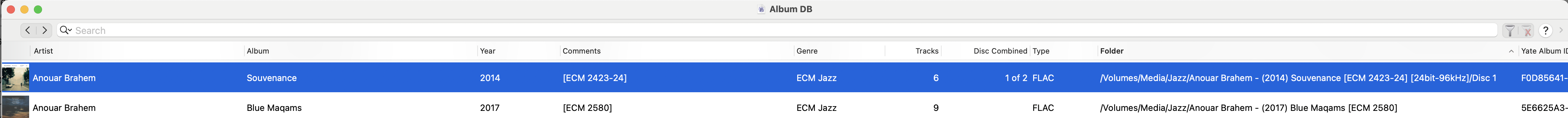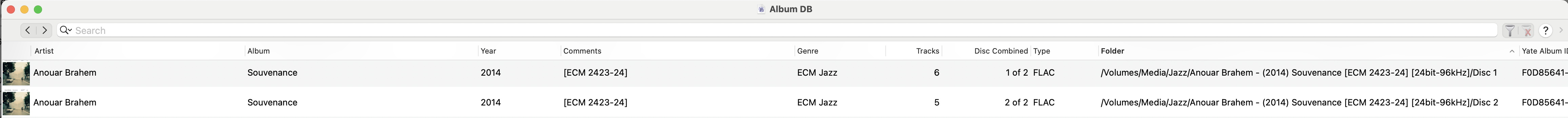 If I run the Create Database Utility action with the Create Yate Album IDs if missing option on the source folder of my library, that same album gets listed on 2 rows (Disc Combined > 1 of 2, 2 of 2) in the Album database AND each disc gets its own unique Yate Album ID, so 2 different Yate Album IDs for the album.