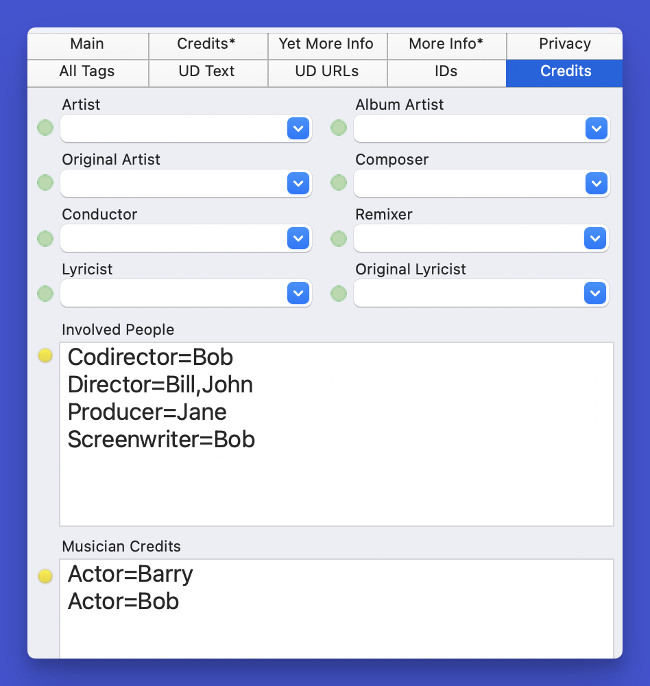 Directly edit in Musician Credits or Involved People.
